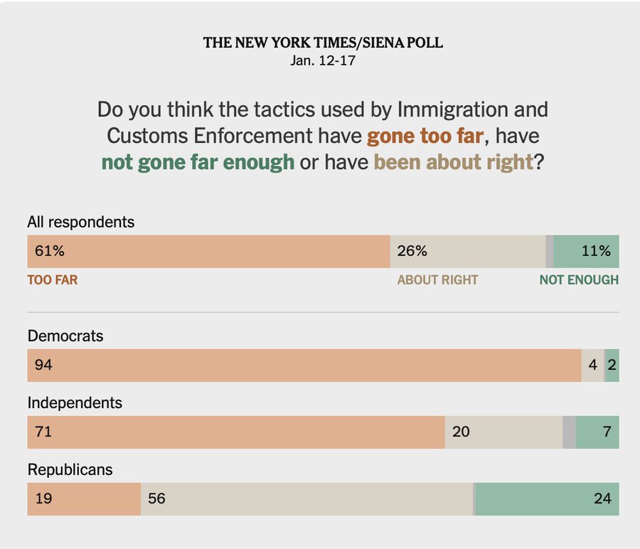 And that’s just the tip of the spear. The actions of ICE and other federal officials – particularly in DHS leadership and at the White House – have been un-Constitutional, unlawful, and amoral for weeks now. Which is part of the reason polling about ICE looks like this, even *before* this weekend’s events: